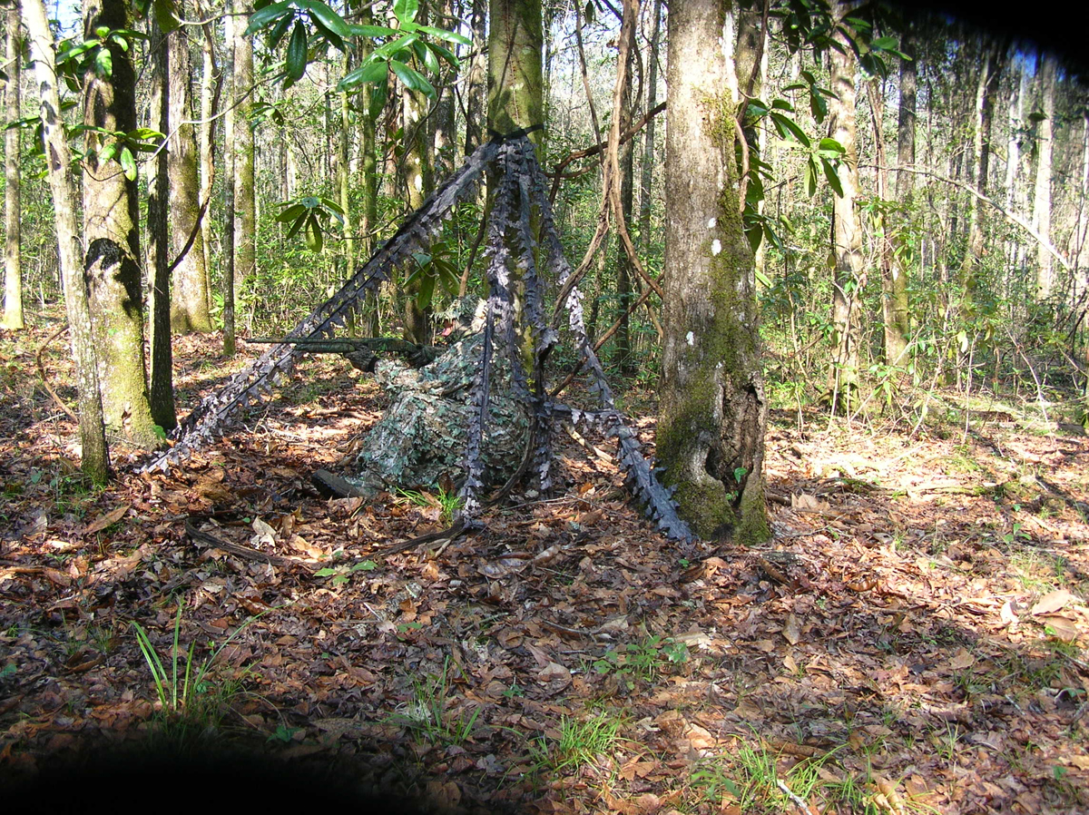 The Spiderblind is a ground blind that is durable, light and sets up quickly. It also takes down and packs up quickly in its own storage bag. This design is perfectly suitable for the turkey/deer hunter always on the move. It is made of a nylon fabric printed with True Timber camouflage conceal green pattern. The edges of the blind are cut with a leaf pattern that enables it to have the realistic look and movement of a leaf with the slightest of breezes. There is over 1000 inches of leaf edge nylon on each blind. It attaches to almost any size tree with a 1" strap and side release buckle. It stakes to the ground with 6 ground stakes. Sewn between the nylon legs of the blind is a 1" black polyproprelene (marine grade) webbing. It can be set up in about 90 seconds and can be taken down and packed up in approximately the same time. It is one of the lightest blinds on the market, weighing less than 2 pounds. The blind is approximately 7.5 feet tall before setup.